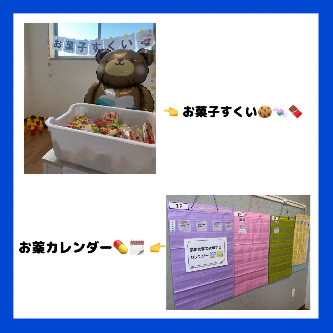 今回もお菓子すくいとお薬カレンダーの展示をしました。