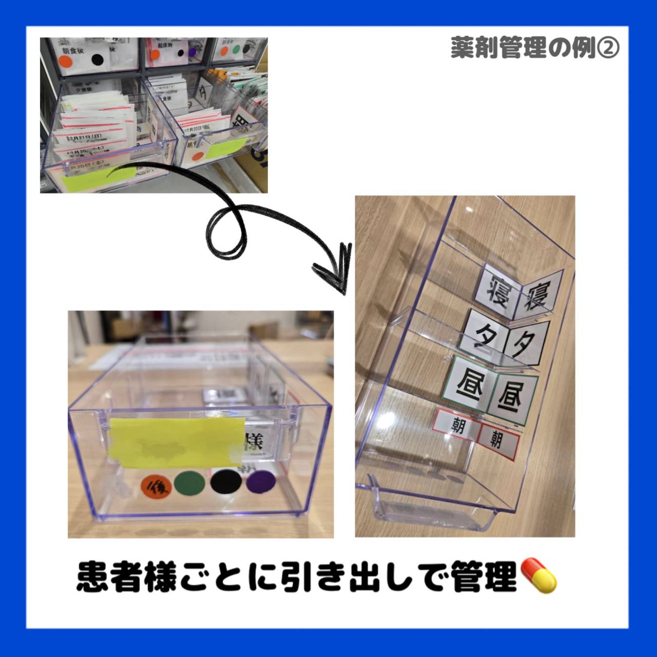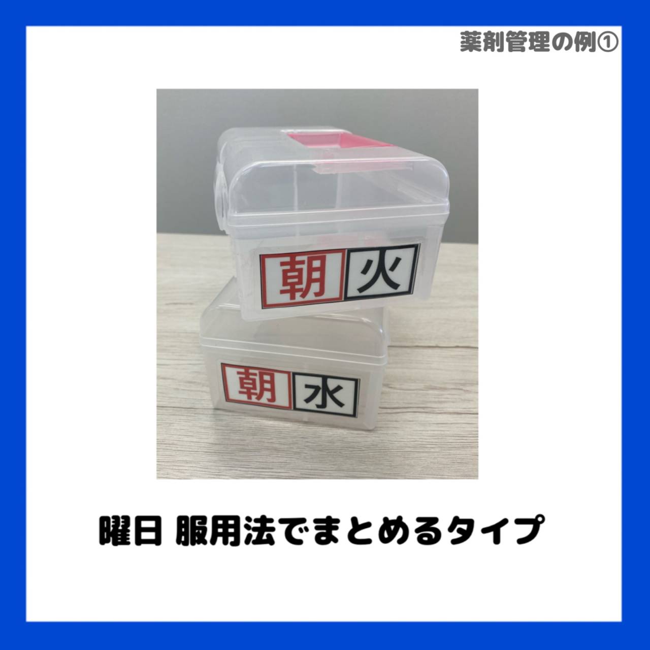 曜日・服用法ごとにまとめるBOXや、患者様ごとに引き出しで管理するタイプもございます。